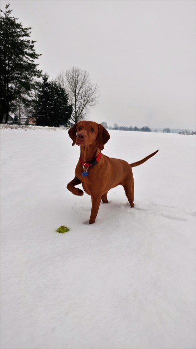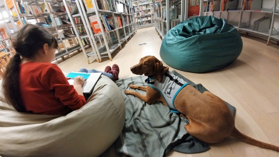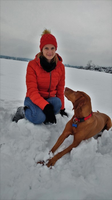 Megi, danes sedemletna madžarska vižla, se mi je pridružila ob zaključku fakultete. Želela sem si prijazno, učljivo in energično sopotnico za tek v naravi in izlete v hribe, a tudi prijetno cartanje doma, zato izbira pasme ni bila naključna. In tako sva začeli svojo skupno pot… Najprej mala šola, nato osnovni trening in izpit iz poslušnosti, vseskozi pa veliko trikcev in igre z žogo. Ko sem tudi sama nadaljevala svojo poklicno pot kot socialna pedagogija, sem začutila, da bi lahko tudi Megi s svojo ljubeznijo do ljudi, pozitivno energijo in navihanim značajem še komu polepšala dan. Po vključitvi v terapevtsko skupino Kosmati smrčki, me tako Megi večkrat pospremi na delo v šolo, skupaj poslušava pravljice, ki nama jih berejo otroci v knjižnici, predvsem pa z največjim veseljem pokaže kakšen trik, sploh če je nagrajen s pasjim piškotom.